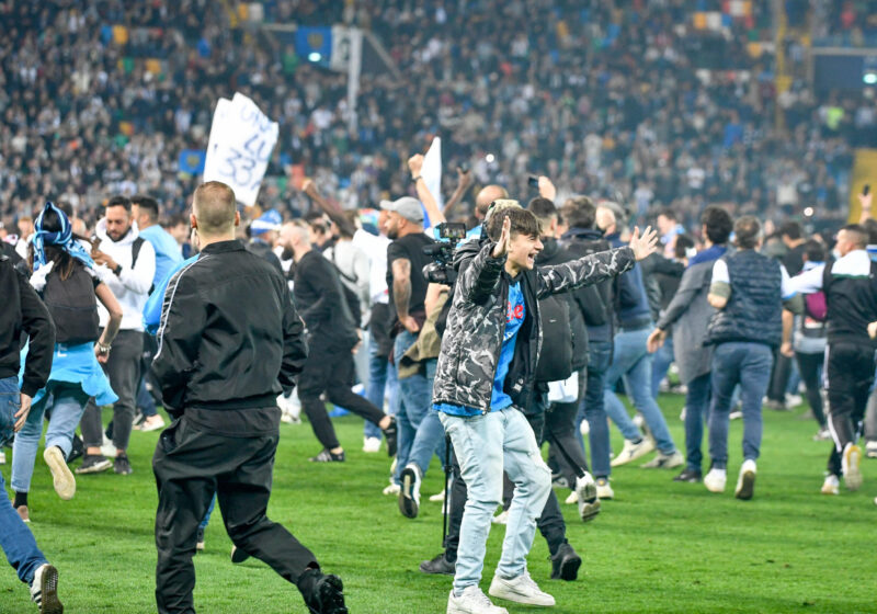 Quella di ieri è stata sicuramente una partita storica per il Napoli. Gli azzurri con il pareggio ad Udine si sono assicurati il loro terzo scudetto e al fischio finale è partita la festa alla Dacia Arena, durante l'invasione di campo alcuni tifosi si sono lanciati verso i loro beniamini e qualcun altro ha cominciato a prendere pezzi del terreno dello stadio friulano per poi metterli in vendita su Internet. In una foto si possono notare due tifosi che rubano piccole porzioni di campo e uno dei due scatta una foto del "bottino". Il manto verde è stato poi riposto in una busta e portato al sicuro per poi essere venduto su Internet.