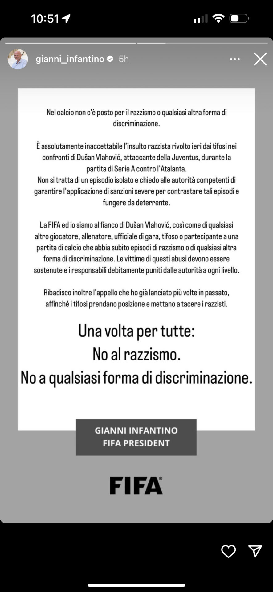 In seguito alle accese polemiche, anche il Presidente della FIFA, Gianni Infantino, è intervenuto sulla questione, difendendo Dusan Vlahovic: «Nel calcio non c’è posto per il razzismo o qualsiasi altra forma di discriminazione. È assolutamente inaccettabile l’insulto razzista rivolto ieri dai tifosi nei confronti di Dusan Vlahovic, attaccante della Juventus, durante la partita di Serie A contro l’Atalanta. Non si tratta di un episodio isolato e chiedo alle autorità competenti di garantire l’applicazione di sanzioni severe per contrastare tali episodi e fungere da deterrente. La FIFA ed io siamo al fianco di Dusan Vlahovic, così come di qualsiasi altro giocatore, allenatore, ufficiale di gara, tifoso o partecipante a una partita di calcio che abbia subito episodi di razzismo o di qualsiasi altra forma di discriminazione. Le vittime di questi abusi devono essere sostenute e i responsabili debitamente puniti dalle autorità a ogni livello. Ribadisco inoltre l’appello che ho già lanciato più volte in passato affinché i tifosi prendano posizione e mettano a tacere i razzisti». Per poi concludere a caratteri cubitali: «Una volta per tutte: No al razzismo. No a qualsiasi forma di discriminazione di discriminazione».