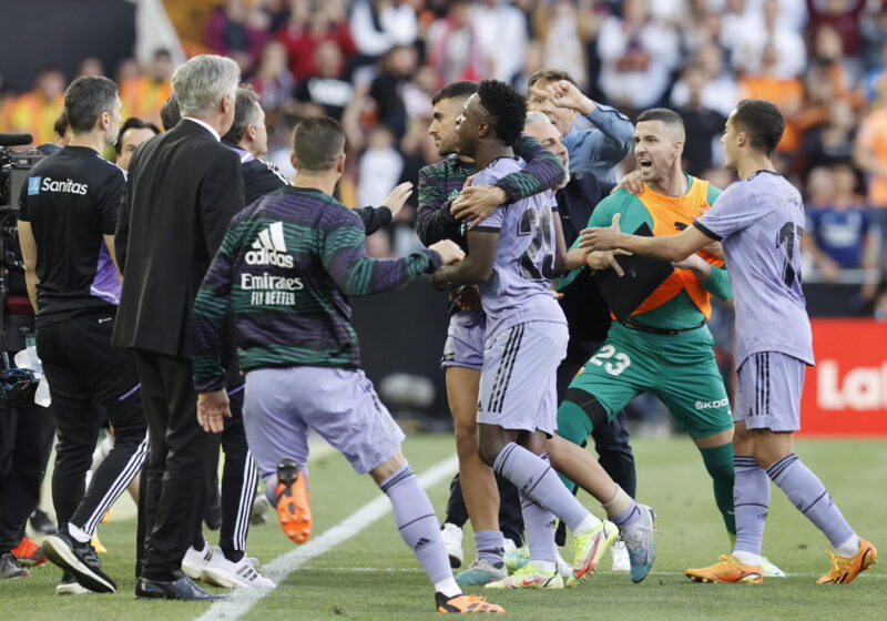 Partita tesa sin dal primo minuto, ma il primo tempo scorre via veloce con il Valencia che trova il gol del vantaggio grazie alla rete di Diego Lopez. Nella ripresa però il calcio giocato passa in secondo piano. Inizia tutto al 69’: Vinicius affronta Foulquier in dribbling, ma in campo arriva una seconda palla che Cömert calcia addosso all’attaccante dei Blancos interrompendo l’azione. Vinicius inizia a protestare e a quel punto, dagli spalti, sente qualcosa che lo fa diventare una furia. Interrompe il gioco, è stanco degli insulti razzisti e indica una parte della tribuna. È quello, è quello dice agli steward e al delegato sul campo e minaccia di smettere di giocare. A poco sembrano servire gli annunci da parte dello speaker del Mestalla. Necessario l’intervento del tecnico, Carlo Ancelotti, l’unico in grado di calmare l’attaccante. La situazione sembra tornare nei ranghi, si riprende a giocare, ma sul finale di gara scatta la maxi rissa dopo un faccia a faccia del brasiliano con Hugo Duro. Vinicius finisce per essere espulso e abbandona il campo tra i fischi e gli insulti di tutto lo stadio.