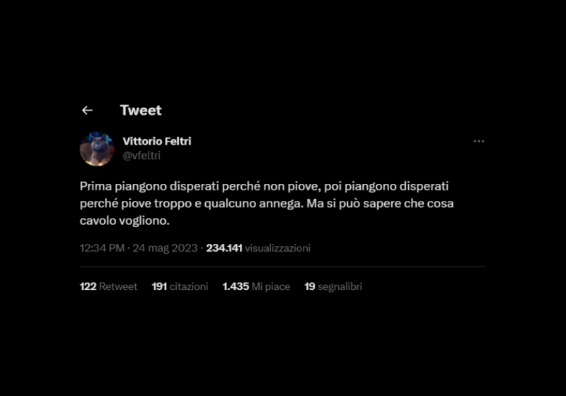 Il famoso giornalista e attuale consigliere regionale della Lombardia per Fratelli d'Italia, Vittorio Feltri, ha suscitato l'indignazione di molti cittadini di Forlì con un tweet insensibile in seguito all'alluvione che ha colpito la città.