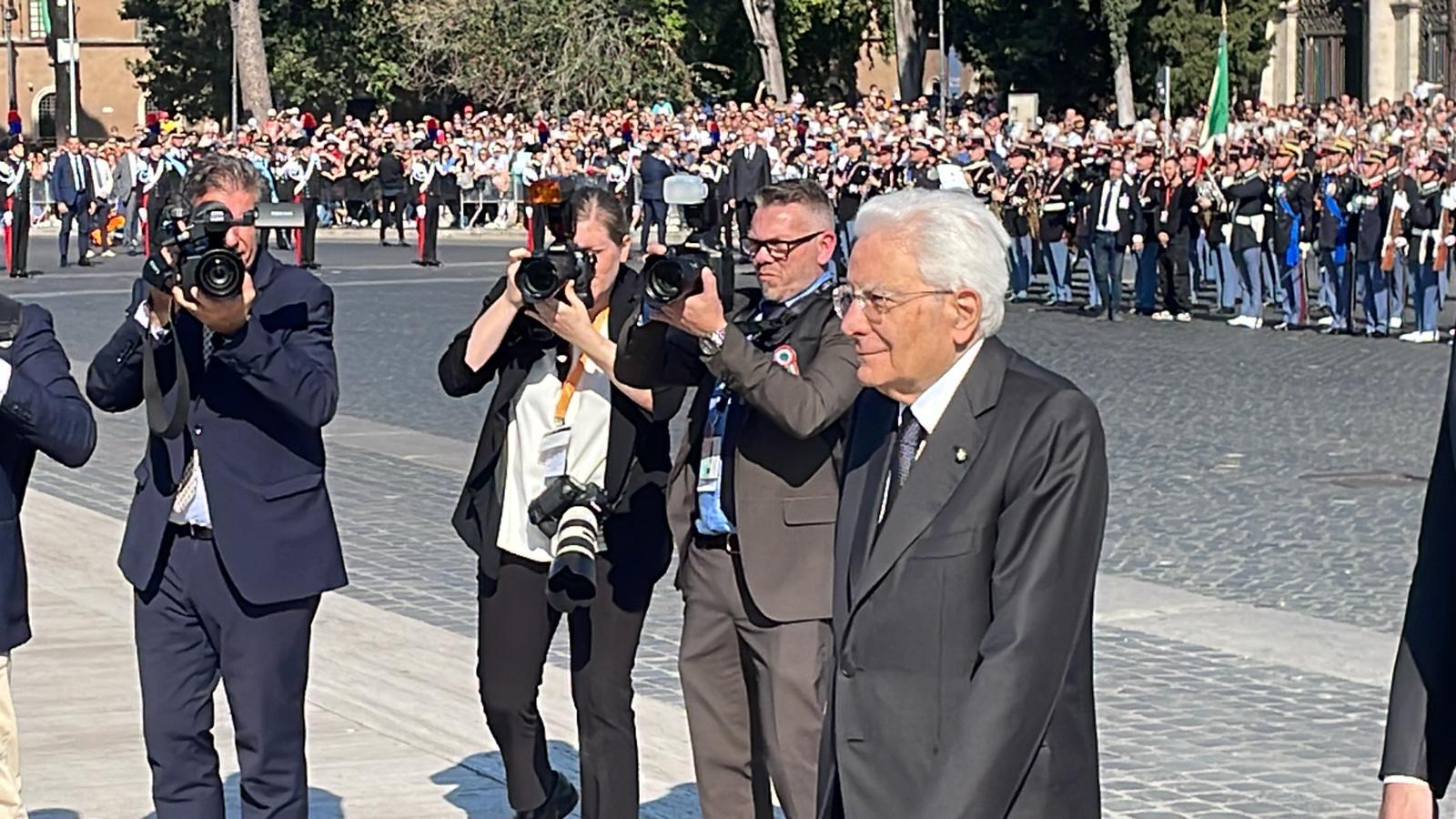 Dopo l'abituale concerto al Quirinale della giornata di ieri, le più alte cariche dello Stato - dalla presidente del Consiglio Giorgia Meloni ai presidenti di Senato e Camera Ignazio La Russa e Lorenzo Fontana, fino ai ministri - si radunano al Vittoriano al seguito del Presidente della Repubblica Sergio Mattarella per rendere omaggio alla nazione, come abitudine dagli anni Quaranta del '900.