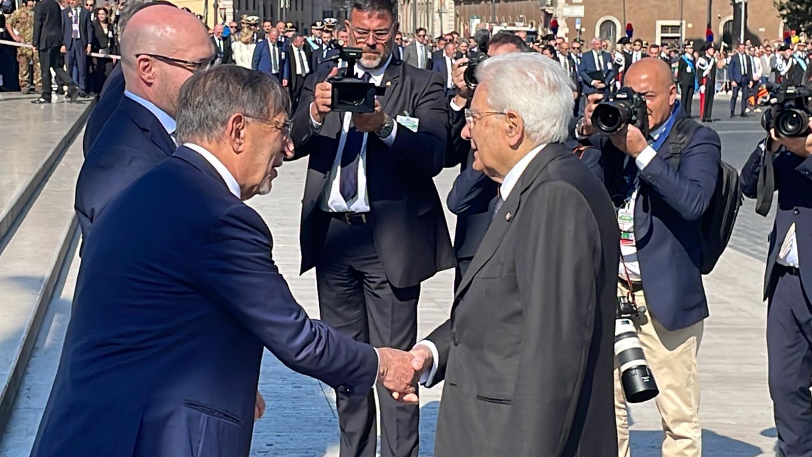 Proprio la seconda carica dello Stato, Ignazio La Russa, al suo arrivo al Vittoriano, rivolge un saluto ai cronisti presenti, con l'augurio di "Buona Festa della Repubblica".