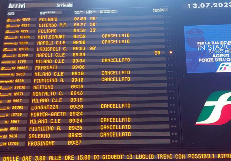 Disagi e treni cancellati oggi 13 Luglio 2023 a causa dello sciopero di Trenitalia, Trenord e Italo.