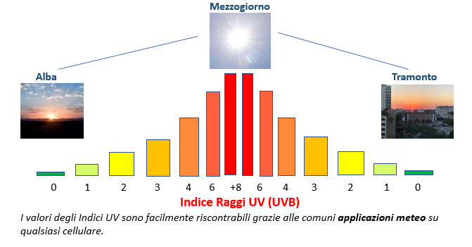 I valori riportati rappresentano il rischio di esposizione al sole per la persona media priva di protezione. Il rischio di esposizione al sole per la pelle non protetta esiste sempre, anche a bassi valori.