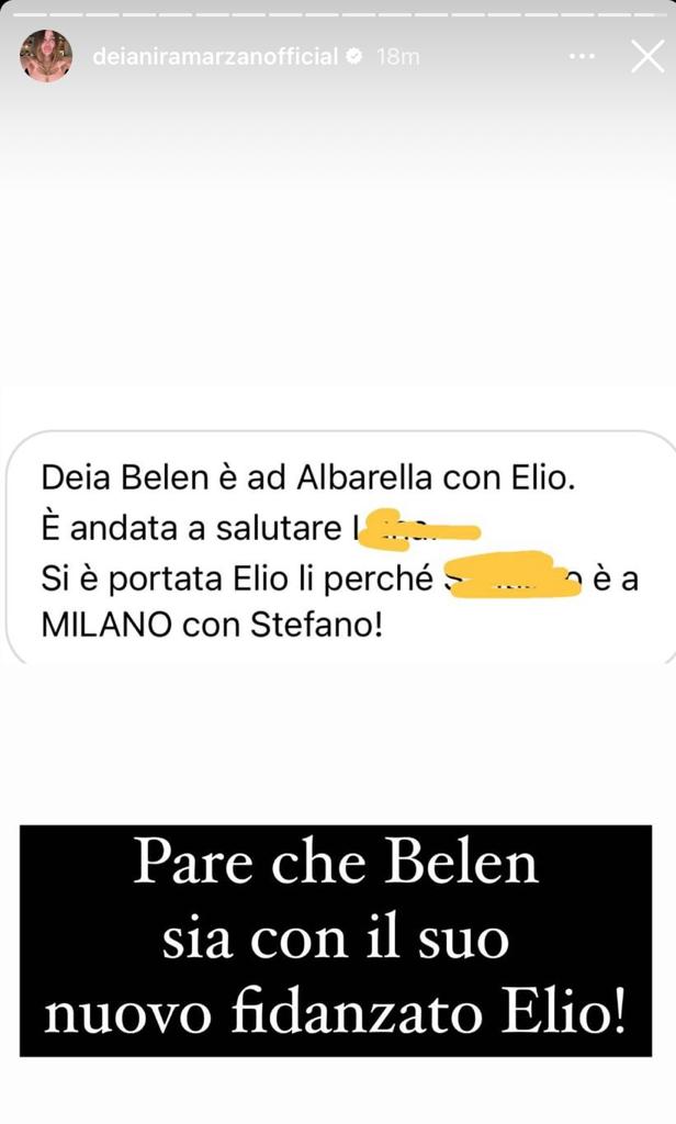 L'indiscrezione arriva dal profilo di Deianira Marzano, che ha ricevuto una segnalazione anonima secondo cui Belen sarebbe ad Albarella con Elio Lorenzoni, mentre il figlio Santiago è a Milano con il padre Stefano De Martino.