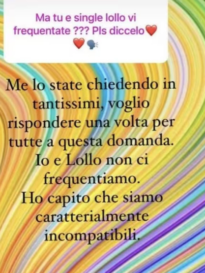 Il sospetto che Alessia e Lollo non stessero più insieme era venuto a molti, vedendo le foto delle vacanze separate, con Lollo che si è unito al folto gruppo di ex partecipanti del reality che ha passato il Ferragosto a Riccione, mentre Ale ha trascorso la settimana tra Roma e Terracina con la sua omonima Alessia Bottiglia.
