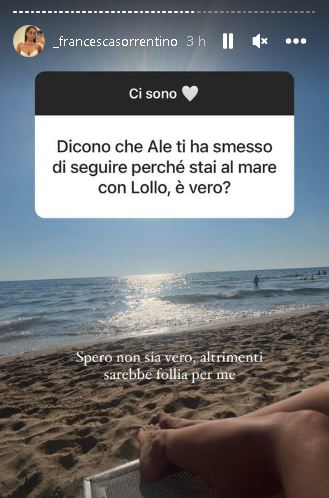 Uno dei fan di Francesca le ha chiesto se fosse per le foto postate insieme a Lollo e la Sorrentino ha risposto: "Spero di no, altrimenti sarebbe follia per me".