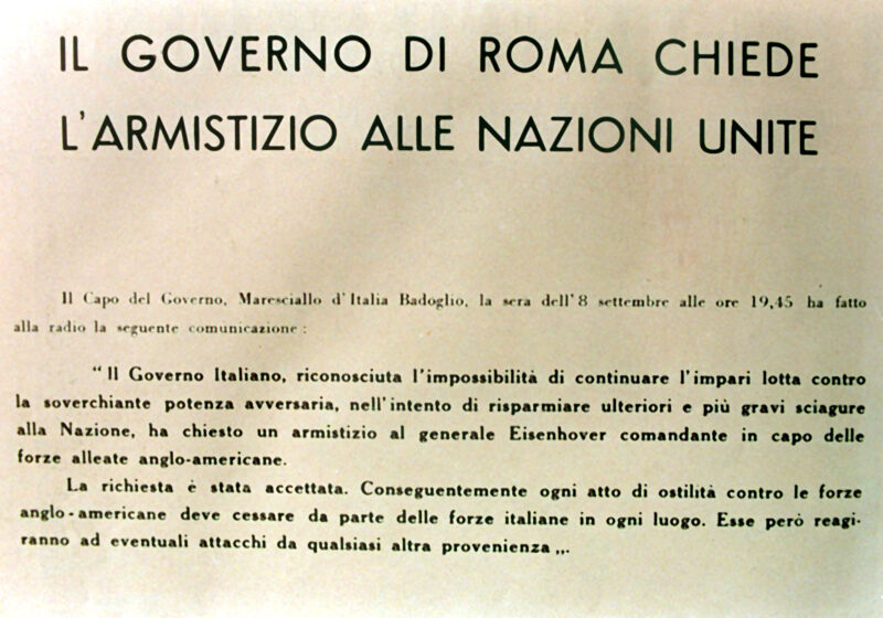 In quei giorni, Mussolini si trovava prigioniero a Campo Imperatore. Solo il 12 settembre, i tedeschi lo libereranno per portarlo a Monaco di Baviera. Nella notte tra l'8 e il 9 settembre sono già fuggiti il re Vittorio Emanuele III, la regina Elena e il figlio Umberto. In realtà, il proclama di Badoglio è stato tutto fuorché esaustivo ed è caotica soprattutto l'organizzazione dell'esercito, spiazzato dalla notizia e dall'equivoco di fondo: la guerra, infatti, non è ancora finita.