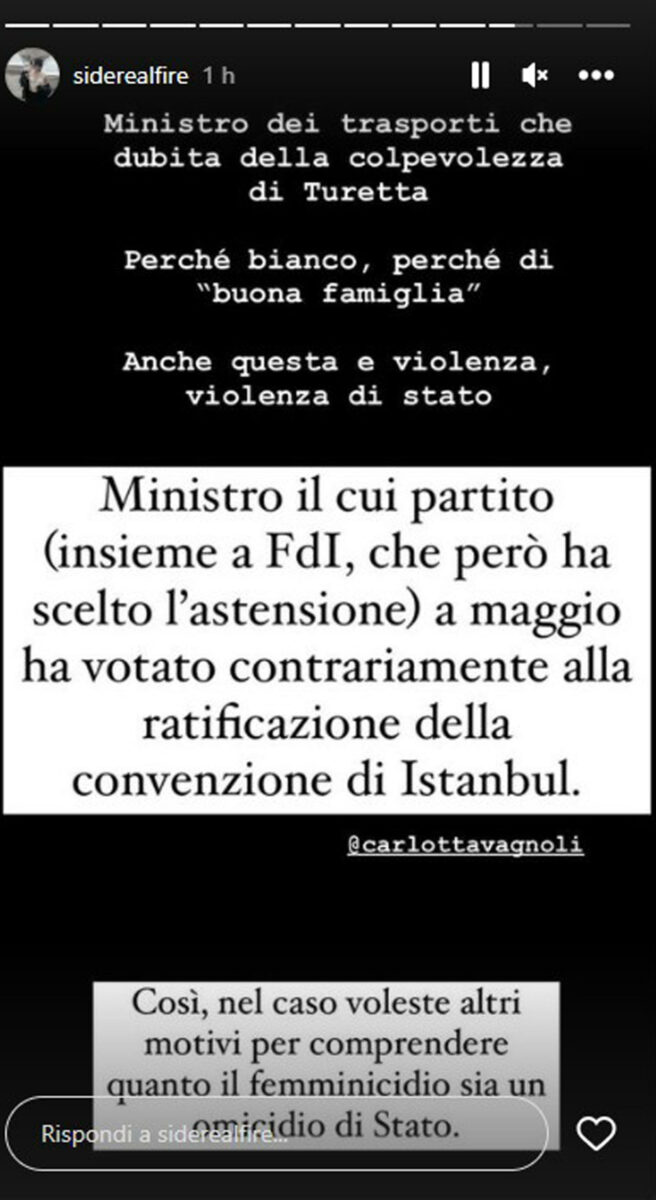 Elena Cecchettin si è scagliata contro Matteo Salvini in una storia, pubblicata oggi 19 novembre, sul suo profilo Instagram: