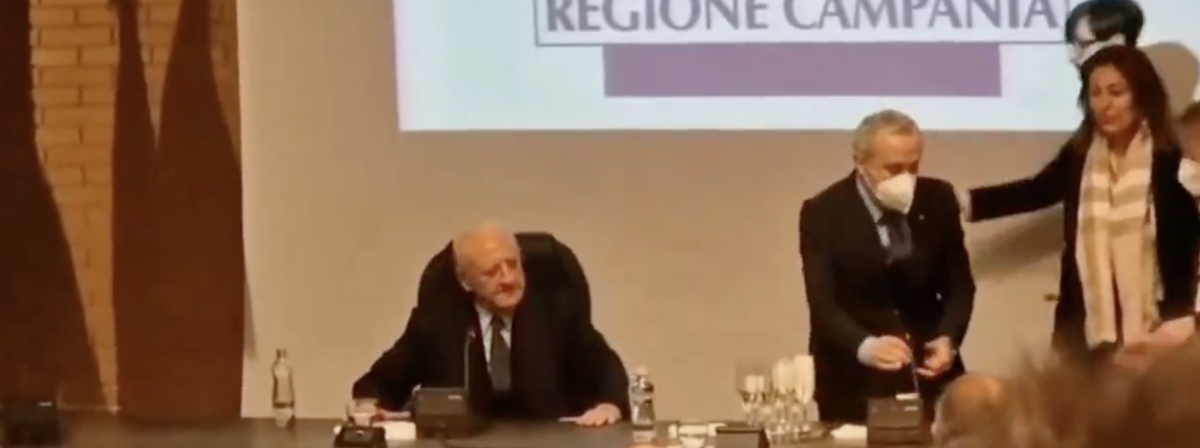 De Luca si era alzato per riempire il suo bicchiere e brindare insieme ai dipendenti della Regione e ai giornalisti, ma una volta tornato alla sedia ha trovato il vuoto dietro di sé. Come di consueto, il governatore ha subito ironizzato sull'accaduto, definendo dei porta seccia ovvero "portatori di sfortuna" due ministri italiani a cui a sua detta, non è molto simpatico.