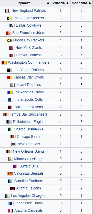 Manca poco alla 58esima edizione del Super Bowl, la finale dell'NFL che vede la miglior squadra dell'American Football Conference affrontare quella della National Football Conference, ben 20 franchigie hanno avuto il privilegio di sollevare almeno una volta il "Trofeo Vince Lombardi" insieme all'anello dei campioni per ciascun giocatore, come evidenziato nella tabella dell'albo d'oro qui presente.