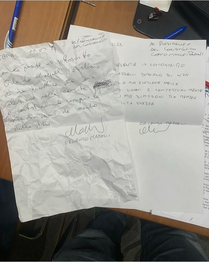 Dopo poco il colpo di scena. Il consigliere Masselli è arrivato in aula e dopo aver strappato la prima lettera, ne avrebbe scritta e firmata una seconda presentandola all’ufficio di segreteria.